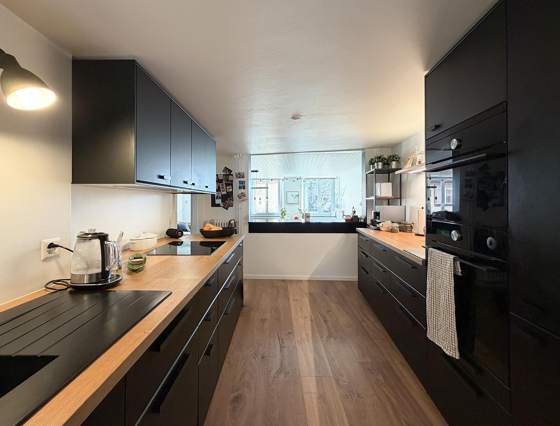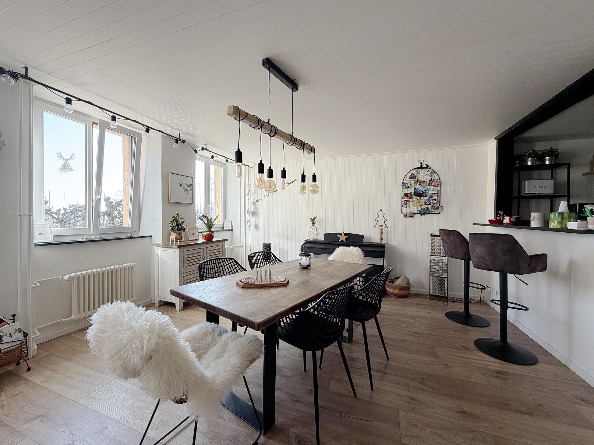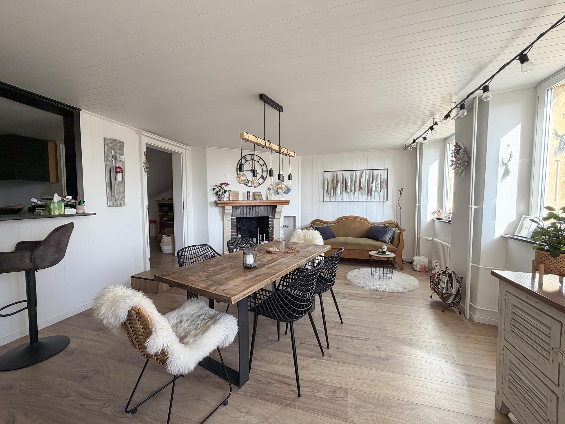 Le premier étage accueille une cuisine ouverte entièrement rénovée, prolongée par une salle à manger conviviale avec cheminée, ainsi qu’une salle de bain récemment remise au goût du jour.